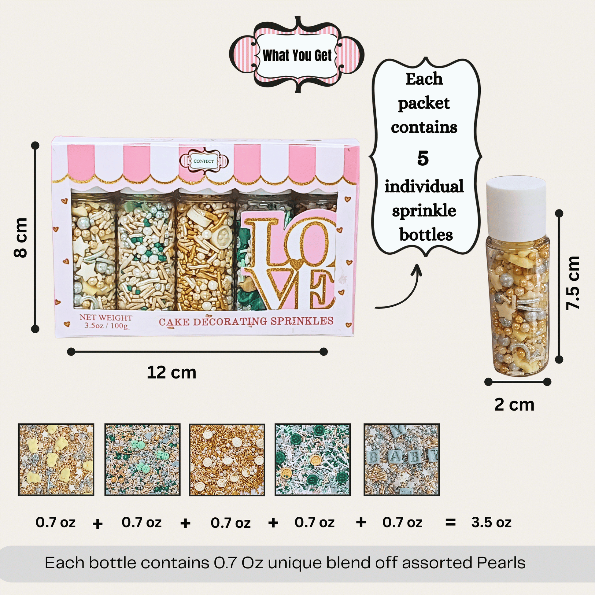 • Each bottle consists of assorted colors, sizes & mixes of sprinkles.
