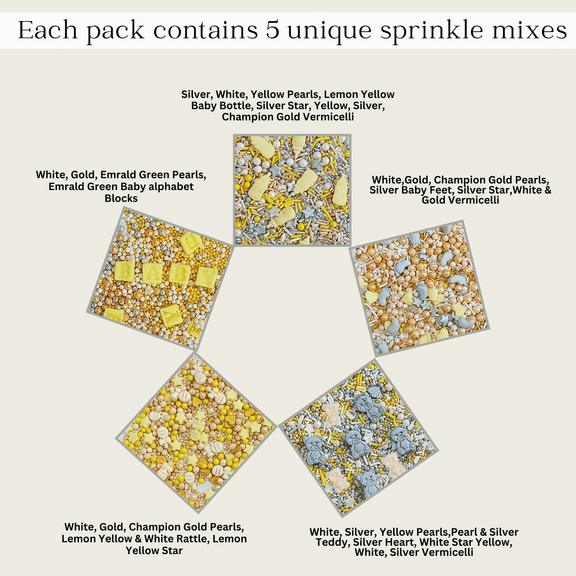 Confect Baby Shower Sprinkles | Gender Reveal Sprinkles | Mix Silver Baby Feet & Feeding Bottle Sprinkles Pack of 5 (BABY SHOWER -10)