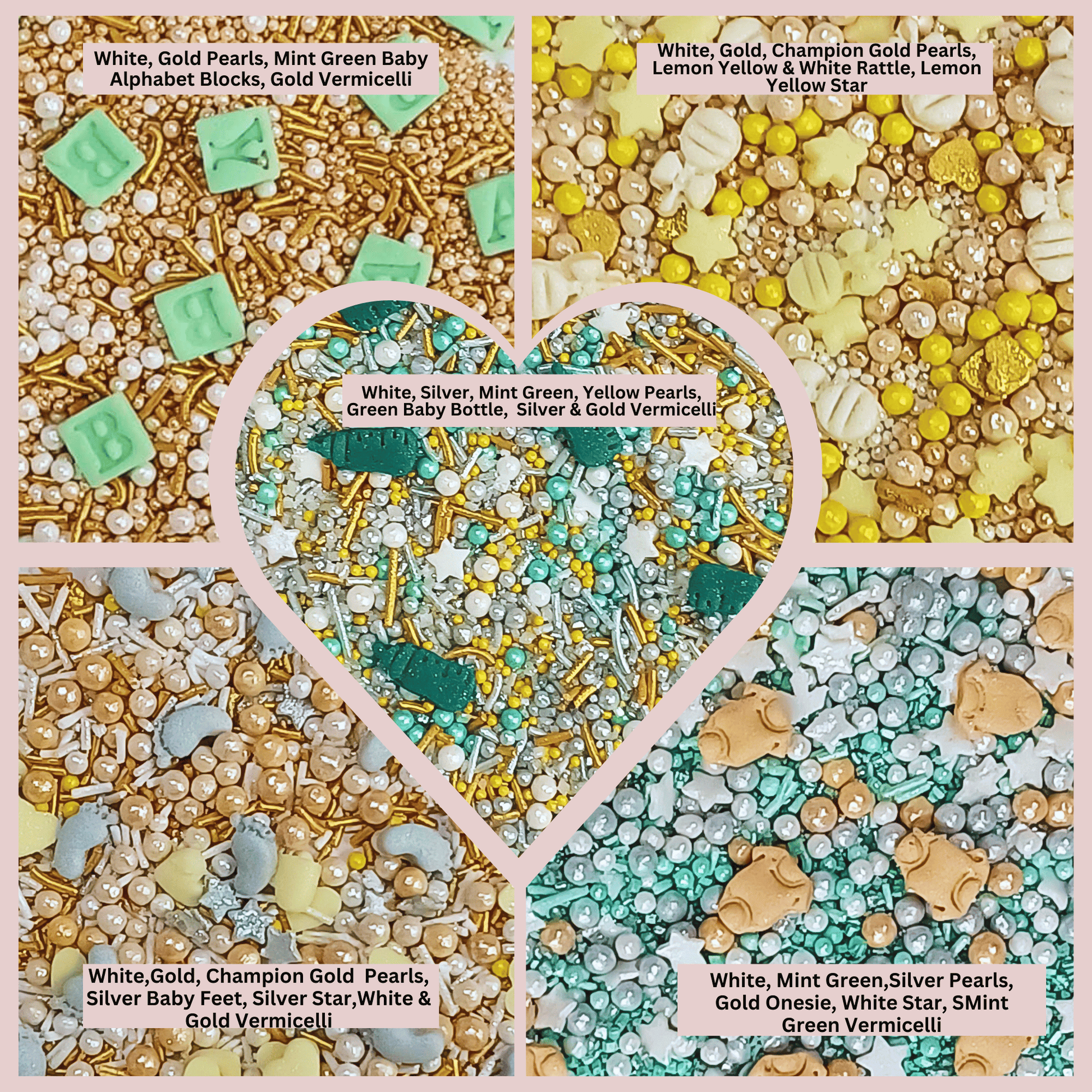 Confect Baby Shower Sprinkles | Mix Gold, Silver, Mint Green & Pearl Dragees Pack of 5 (BABY SHOWER -01)