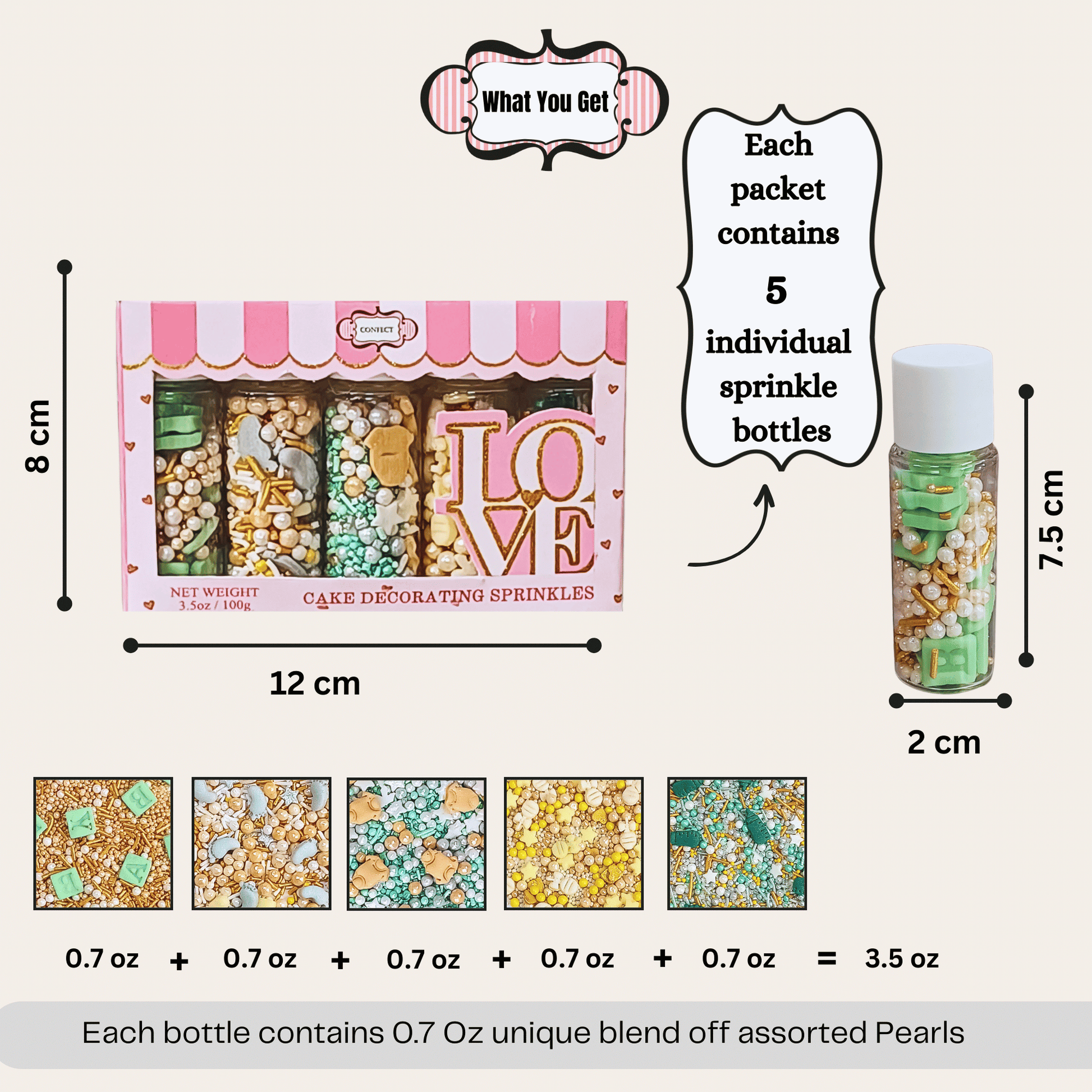 • Our sprinkles come in a unique pack of 5 (5 bottles of 20 grams each).