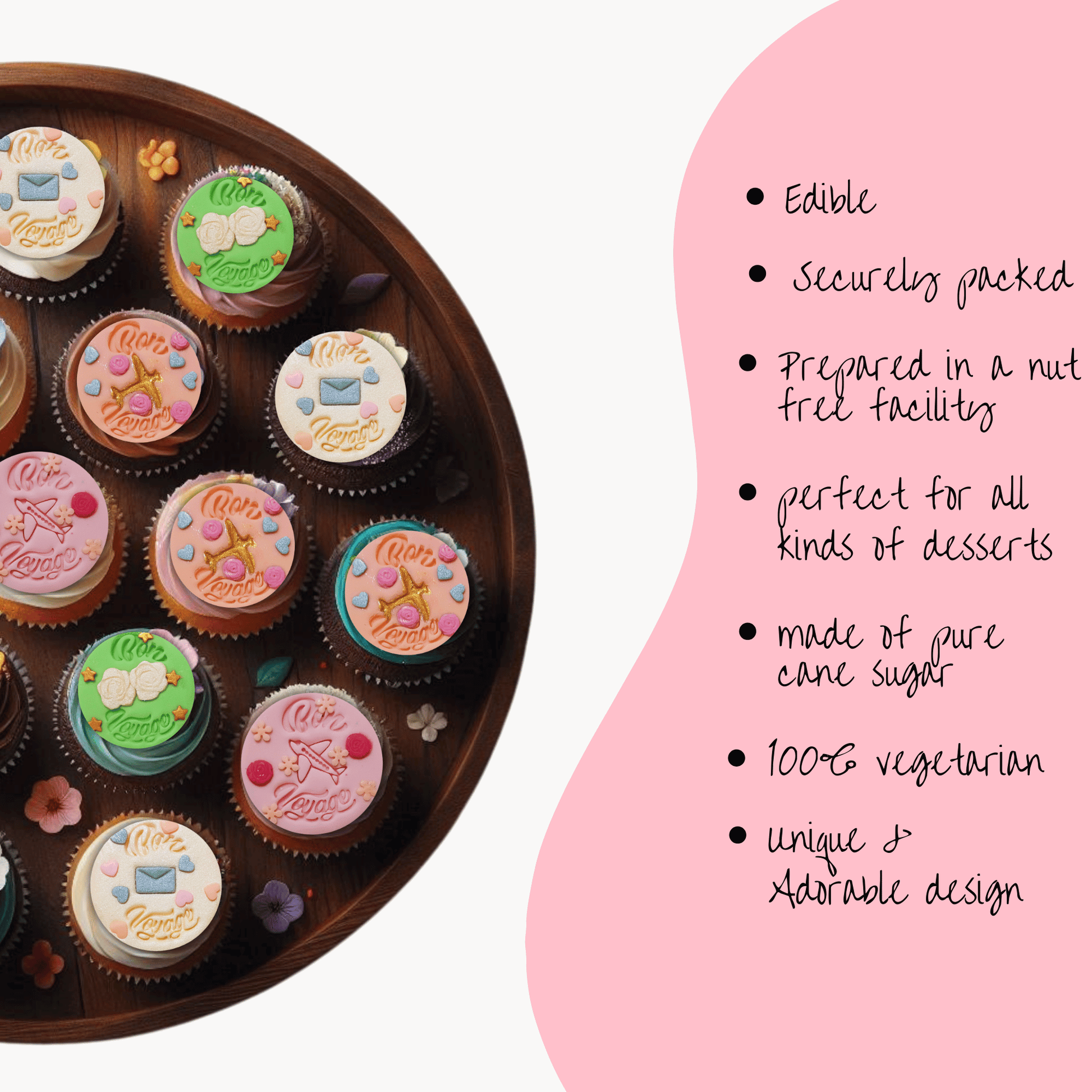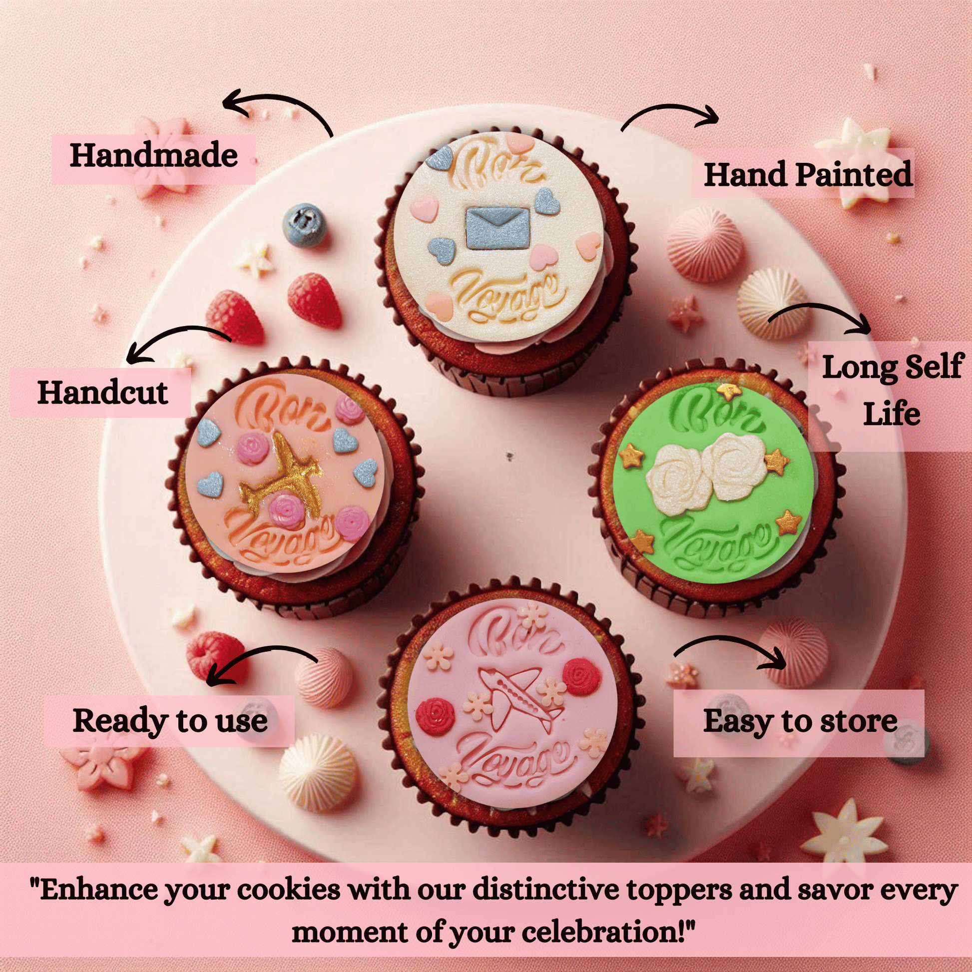 - Edible Birthday, Anniversary, Get well soon, Bon Voyage & Congrats Cupcake Toppers, Mixed colors & Style. Easy to use, so you can insert into your cake directly, which make your cake more beartiful and interesting.