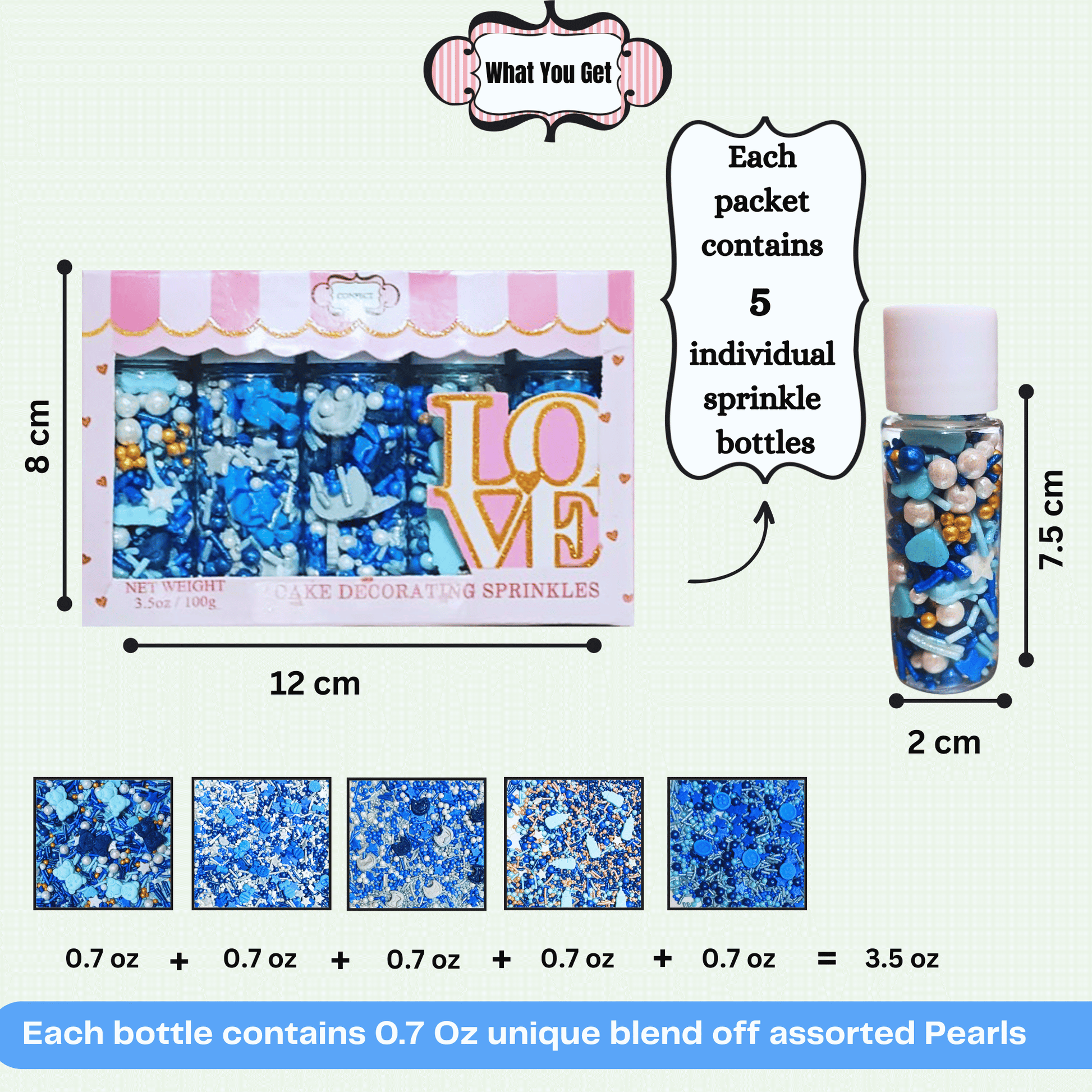 • Our sprinkles come in a unique pack of 5 (5 bottles of 20 grams each).