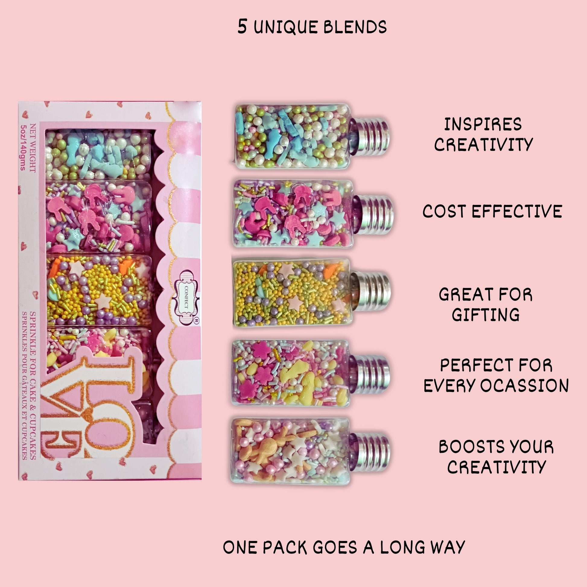 • Our sprinkles come in a unique pack of 5 (5 bottles of 20 grams each).