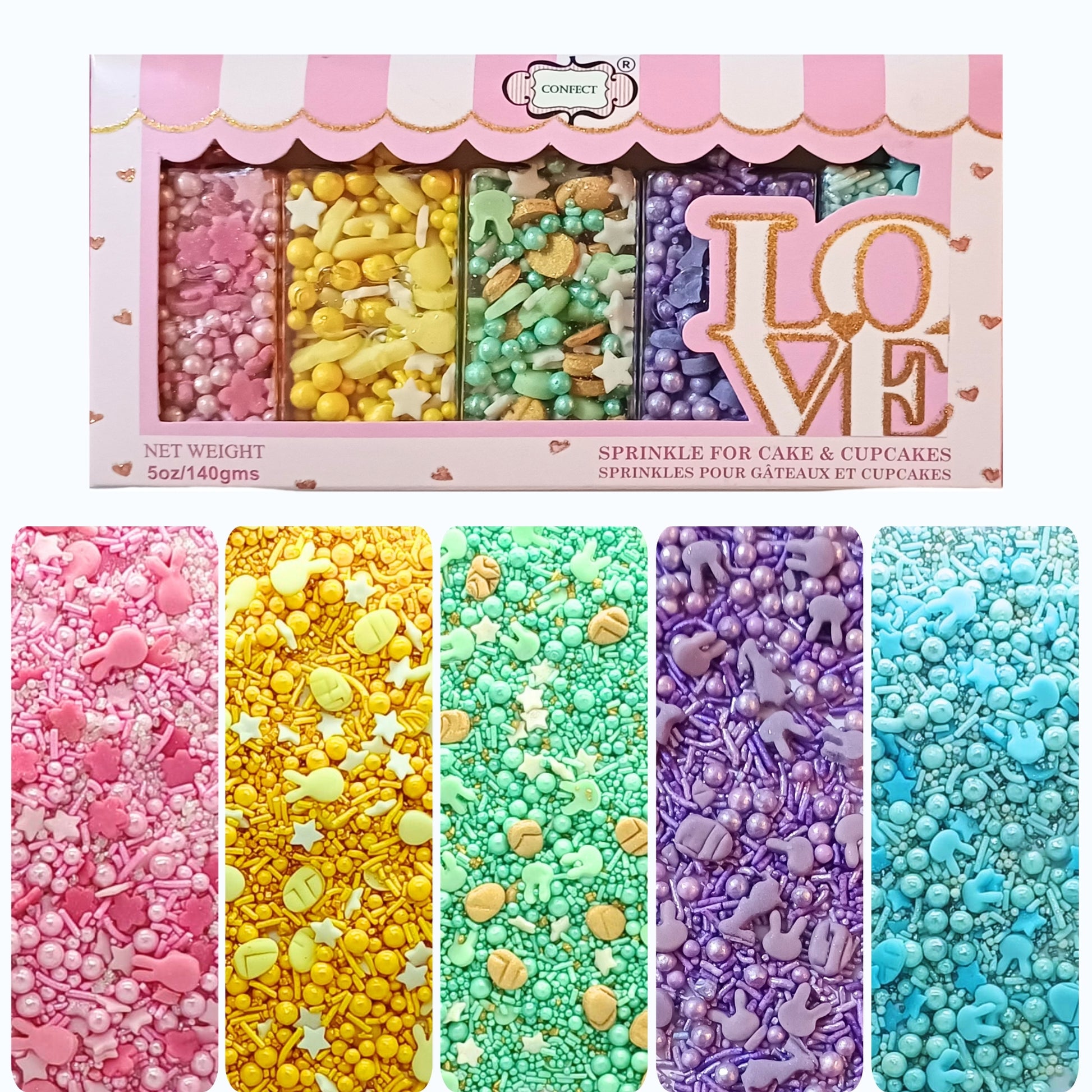 Confect Easter Sprinkles Edible | Mix Parrot Green, Pink, Sky Blue and Yellow Pearls & Stars Pack Of 5 (EAST 5) - 100Gms