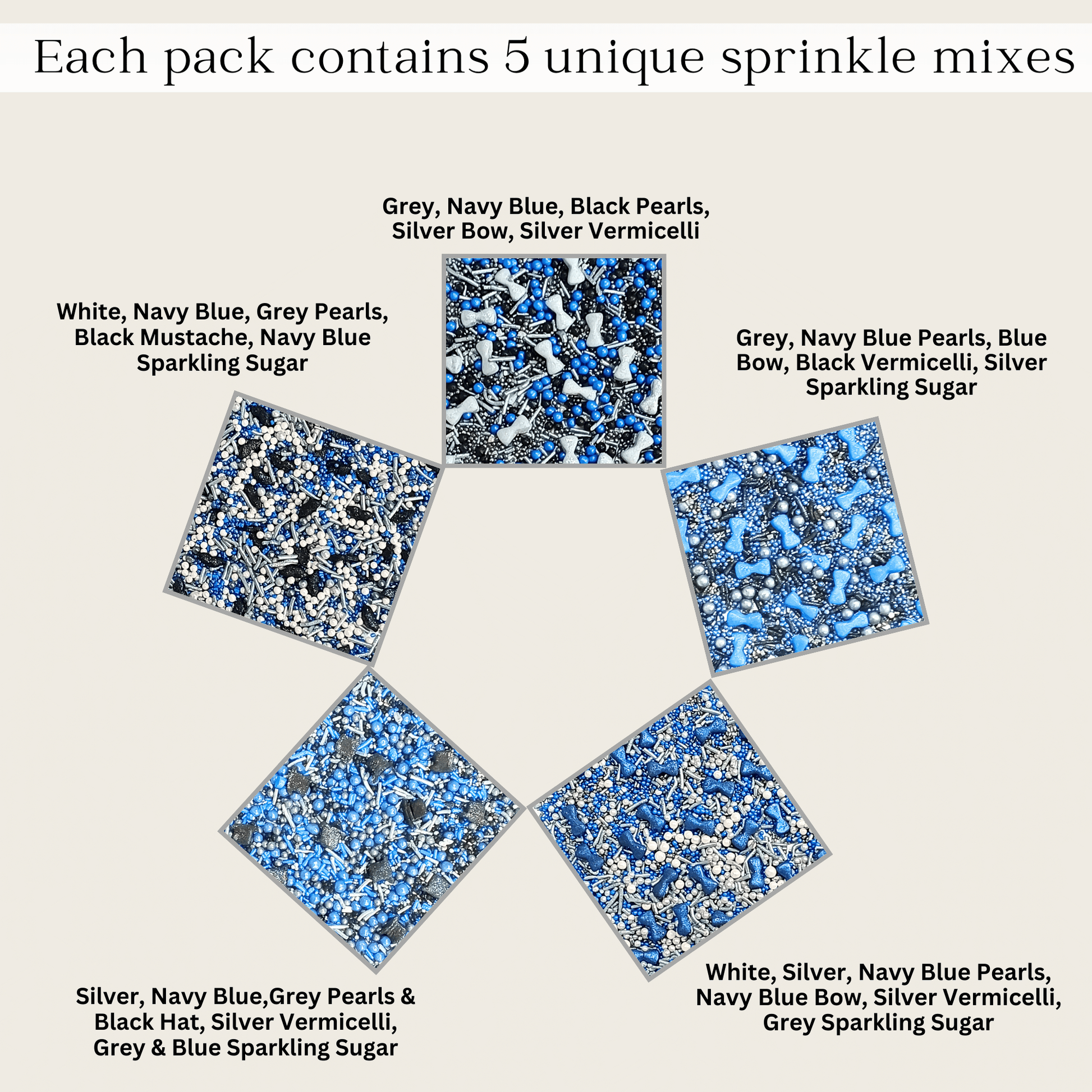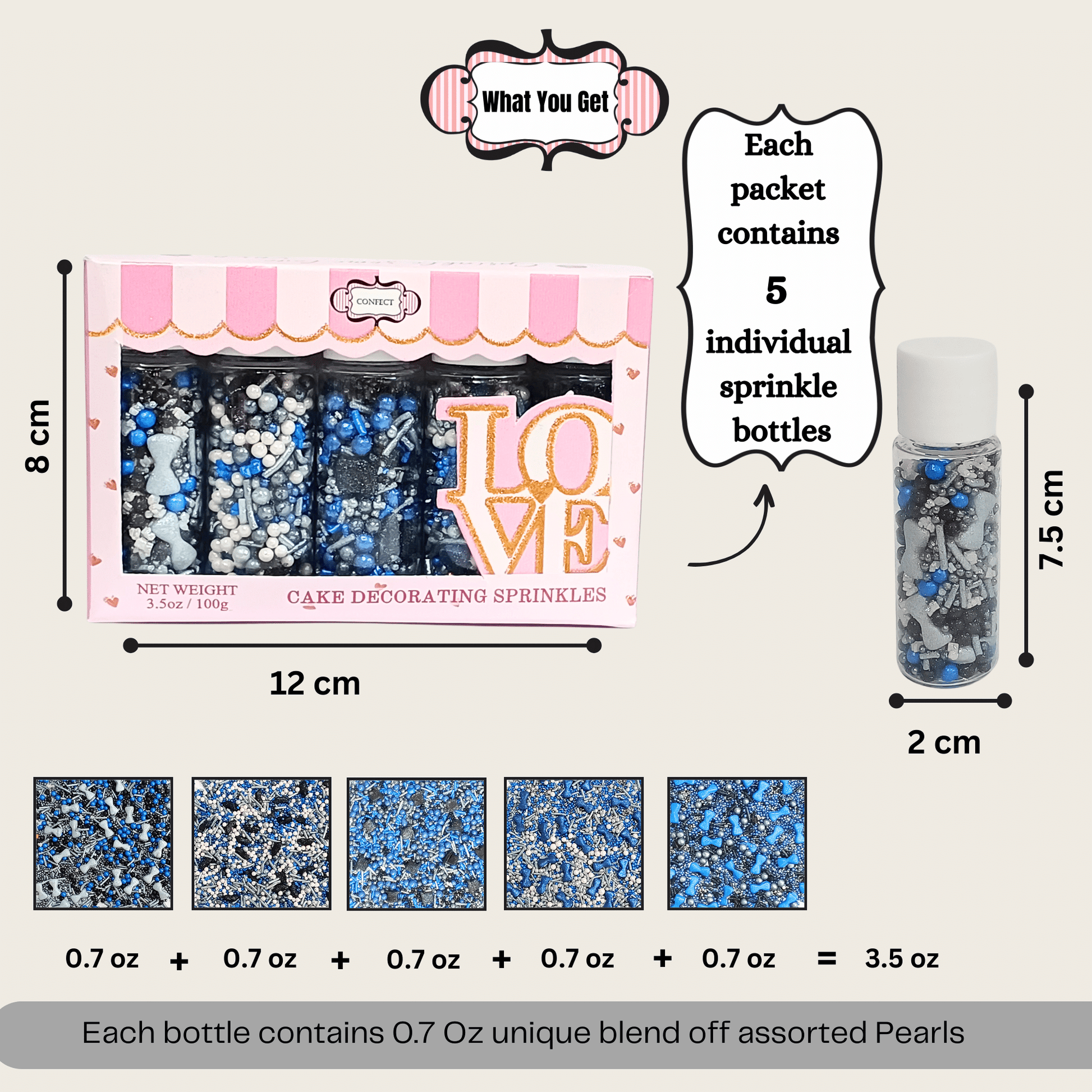 - Our sprinkles come in a unique pack of 5 (5 bottles of 20 grams each).
