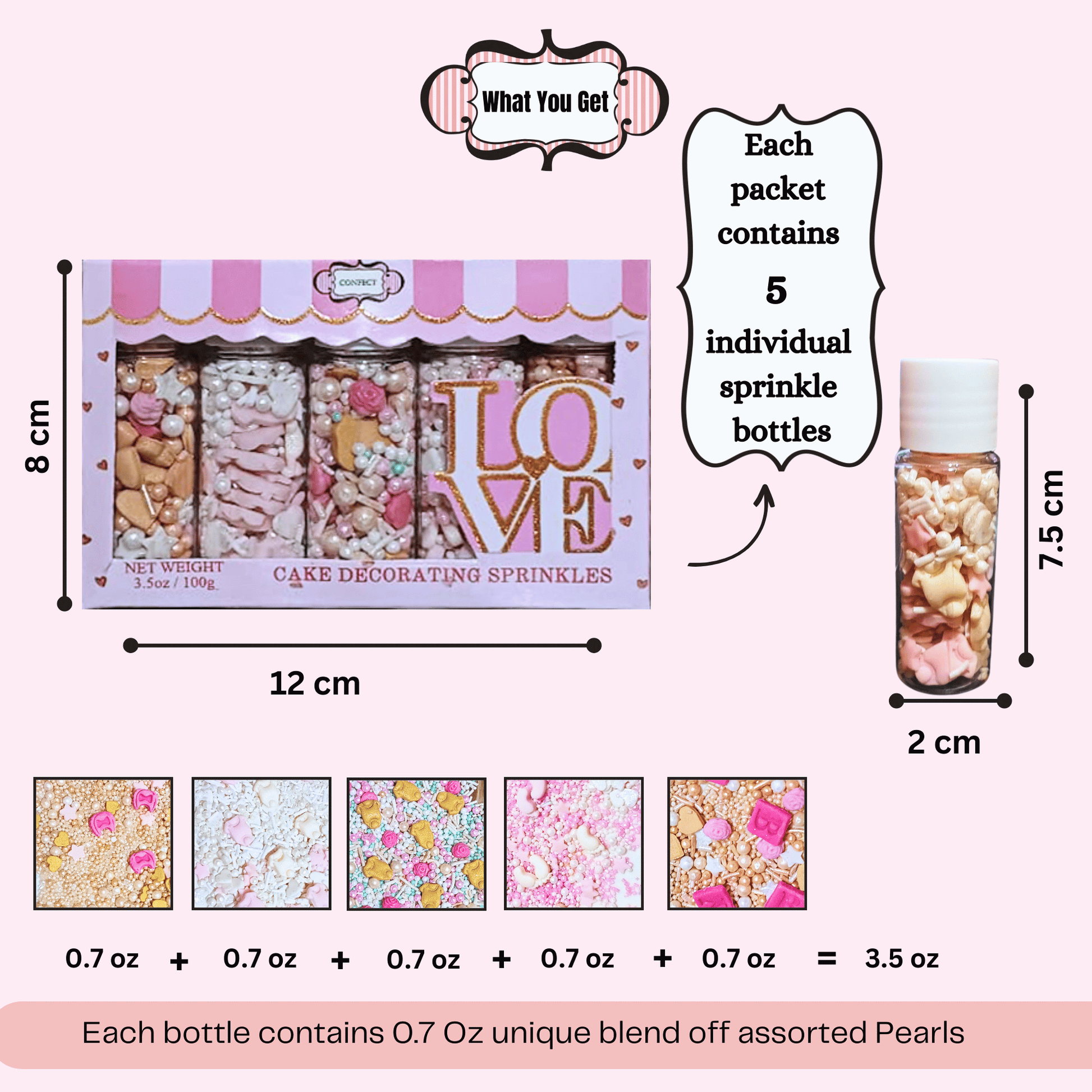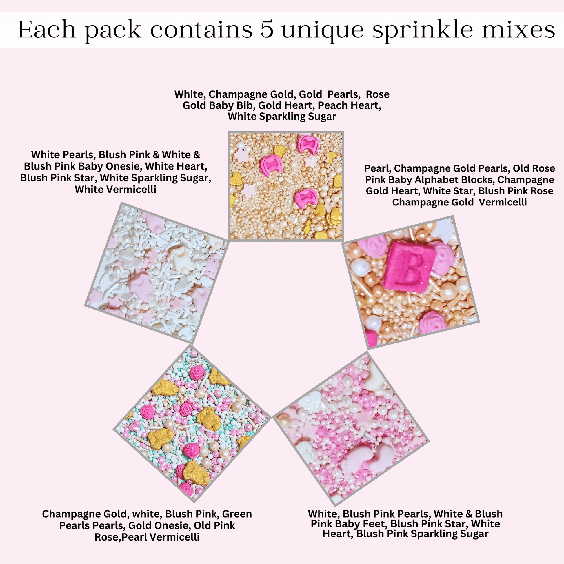 Confect Girls Baby Shower Sprinkles | Edible Sprinkles | Mix Heart, Teddy, Baby Feed Bottle & Baby Feet Sprinkles Pack of 5 (BABY SHOWER -18)
