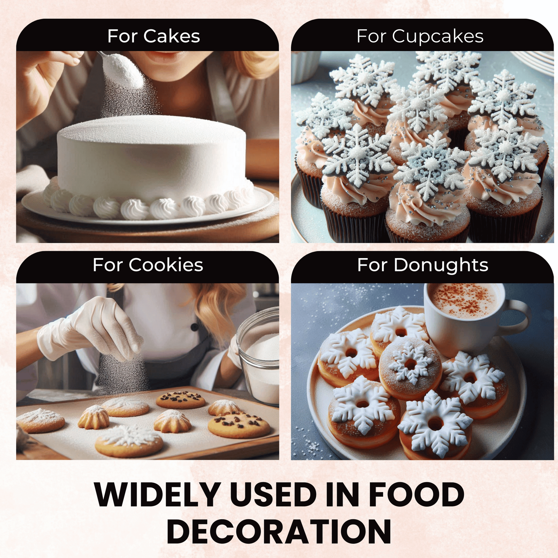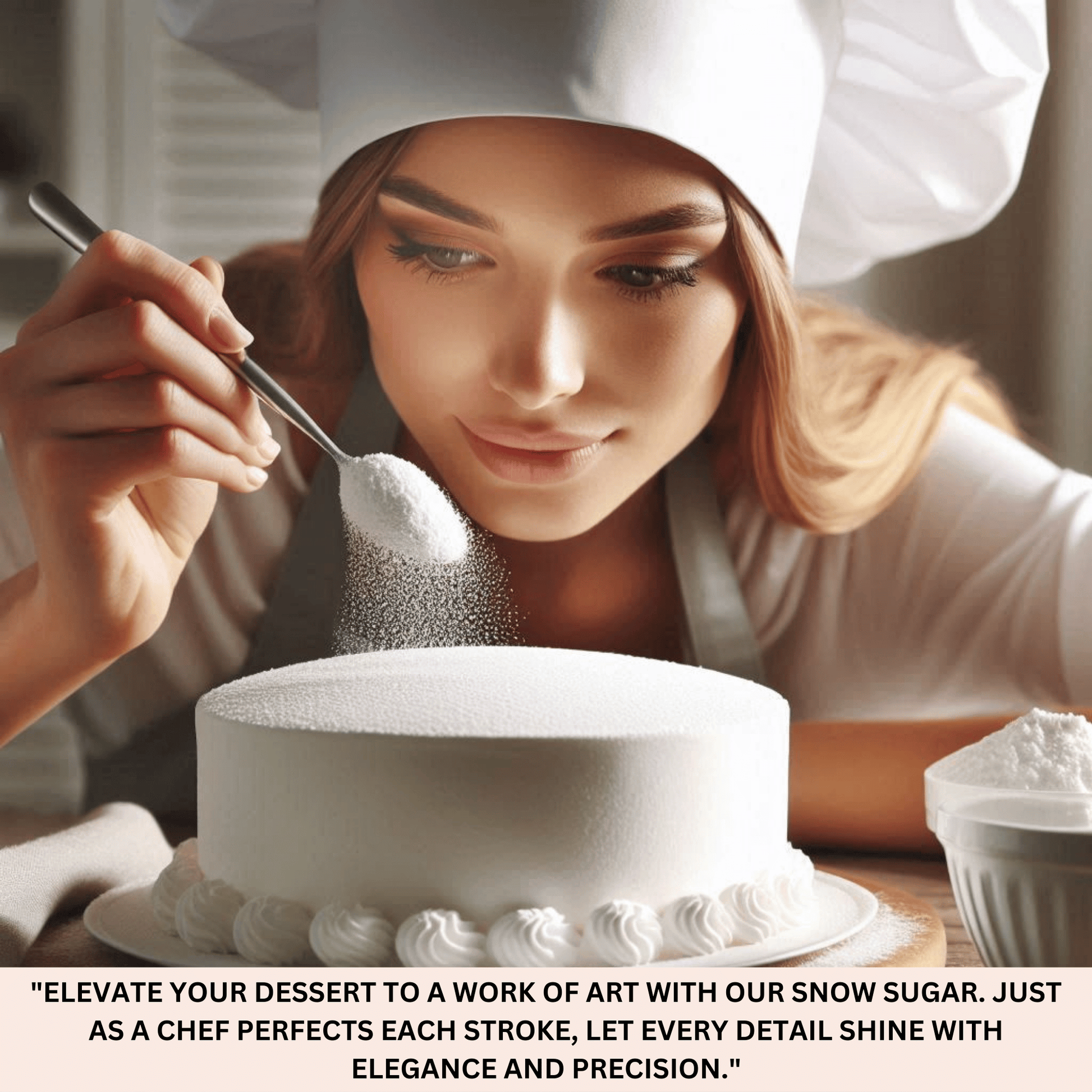 Snow Sugar, also known as non-melting powdered sugar, is the perfect finishing touch for your desserts, adding a delicate and enchanting appearance that lasts. Unlike regular powdered sugar, Snow Sugar is specially formulated to resist melting and dissolving, maintaining its pristine, snowy look even on moist or refrigerated treats.