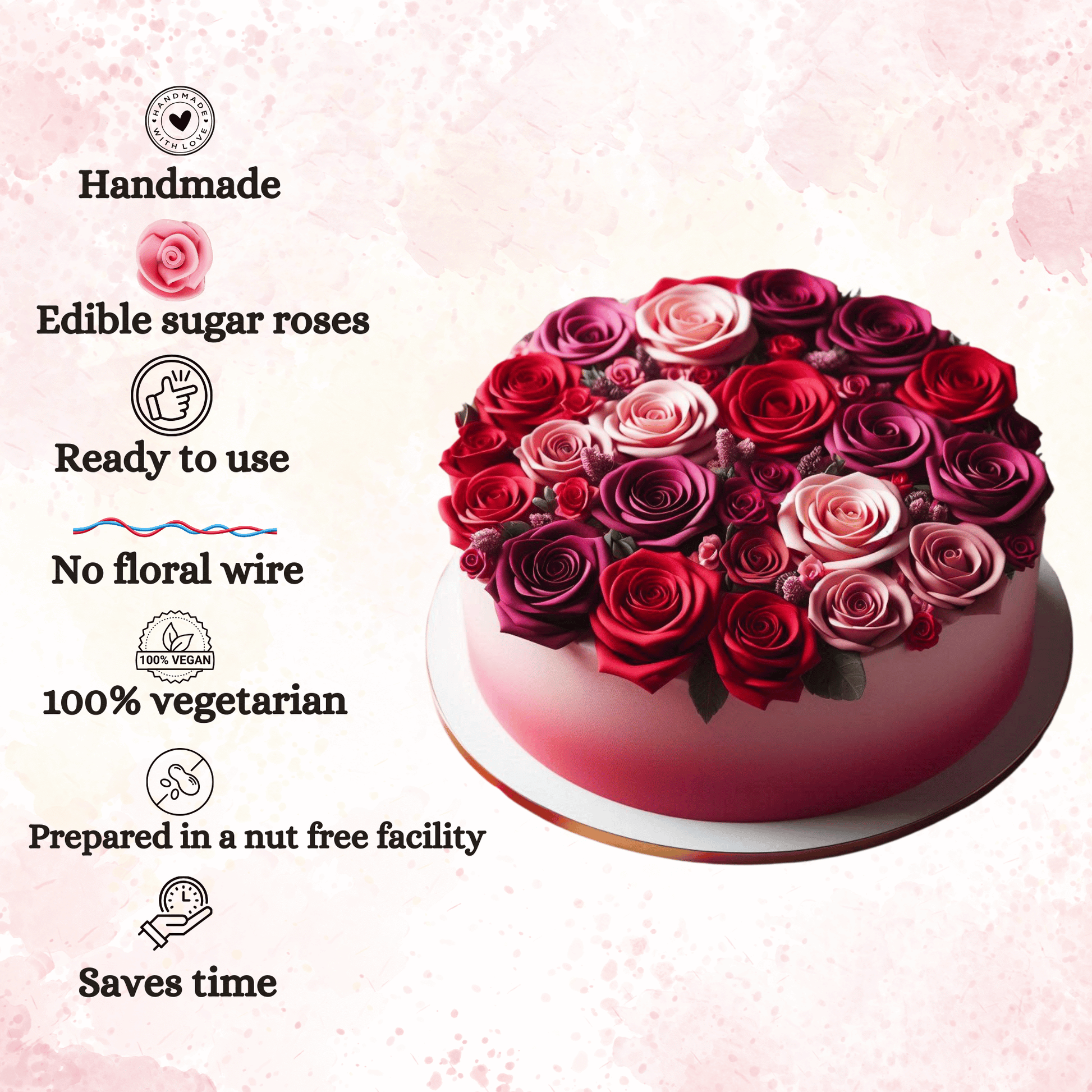 • Hand made edible sugar roses .100% Food Safe. Saves time. Prepared in a 100% vegetarian, egg free & nut free facility