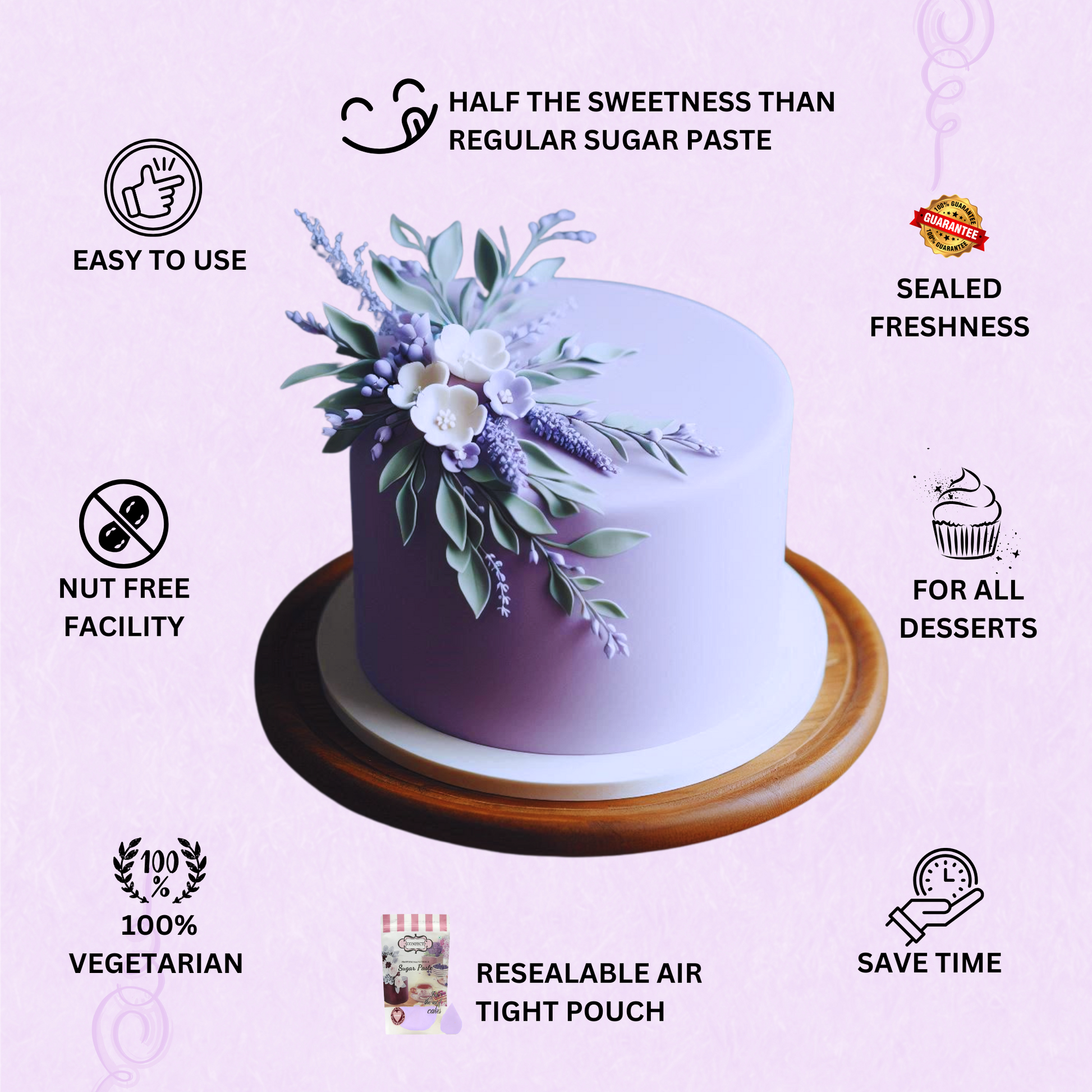 The fondant offers a smooth and consistent texture, making it easy to handle and work with for long periods, ensuring stunning results without cracks or quick drying. Its pastel lavender shade pairs well with other edible decorations, creating an overall harmonious design.